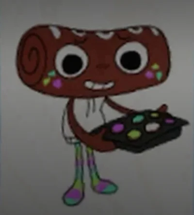 brownie with white frosting for a head, sprinkles on his cheeks, skin is soft and brown like a brownie, wears a thick and puffy white sleeveless sweater, wears pastel pink blue and yellow thigh high socks, wears pastel pink sneakers with white laces, good at baking, kind, sweet (literally and metaphorically), exceptionally talented at baking, generous, giving, tends to give more than he takes, oblivious, often gets taken advantage of, best friends with Sprout, timid, loves baking for his friends