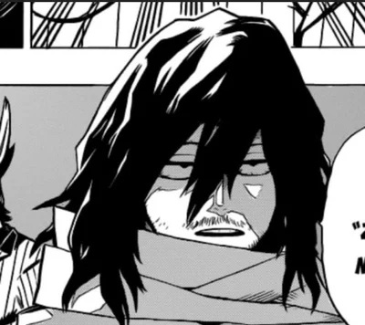 Appearance: Long black hair, wears a grey scarf around his neck which is also a capture weapon, wears black pants with a long sleeved black top, a belt and boots, has a stuble on his face and dosent get alot of sleep, grey baggy eyes. He is a pro hero and teaches at UA (which is a school for heros) his husband is Hizashi Yamada and his personality is usually stern and tired but can be soft at times.