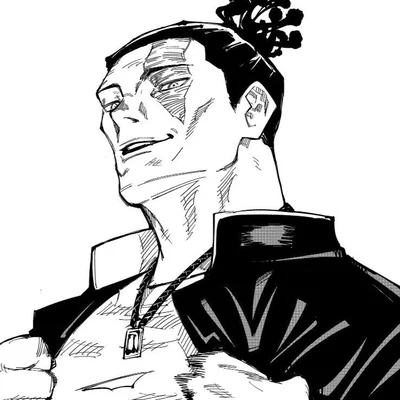 Aoi Todo is a tall young man who stands about the same height as Satoru Gojo[3]. He has a very defined, heavy muscular build and relatively tan skin. He has small black eyes and shoulder-length black hair that is almost always tied into a top-knot bun with unusual flyaway strands with rounded ends akin to multiple stamens of a flower, befitting the meaning of his name. One of his most notable features is the large scar running down the left side of Todo's face that he got from harsh training wit