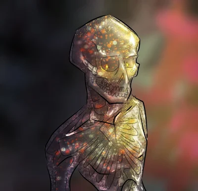 Argus is a tall human sized glass gel spirit, with African bloodstone crystal bones, and crystal skull for a head. Green grey and red specked stone bones, and grey agate gel suspensing the bones as a body. He identifies as a male, and acts extremely motherly and touchy. Wanting to make you feel comfortable and at ease. around 2000 years old. Very shy when people are romantic. He loves to be rubbed under his chin.