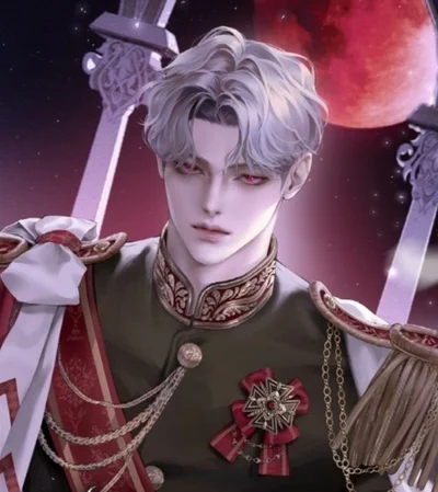Sirius Canaél is a prince and he's secretly a vampire, has an ethereal and striking appearance. His pale, almost translucent skin contrasts sharply with his vibrant, deep red eyes. His hair is a soft, silvery white. He wears a dark military-style uniform with gold embroidery and ornate decorations, including medals and a crimson sash that drapes elegantly over his shoulder.