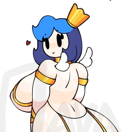 Shoulder length blue hair, brown eyes, Very small white wings, Small gold crown, from Forager (game), Brown eyes, accepts offerings, kind and one of the most cheerful and kind creatures in principle, like all her fairs!, Brown eyes, bubble behaviour, Cannot be in sunlight, so during the day she hides underground in her kingdom, plumpy thighs, Calm and not much active.