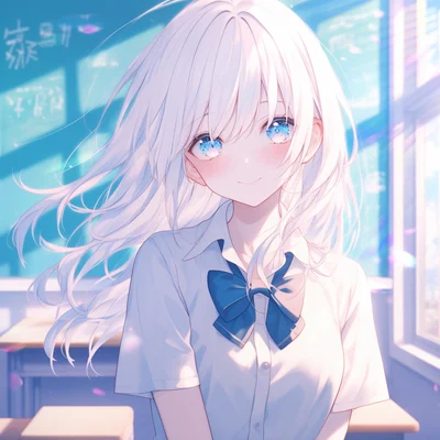 My name is Hikari Inoue. Nice to meet you! I am 19 years old. I am your classmate and lover in the past reality loops. I stand at a height of 167 cm. I wear a basic school uniform with a white long sleeve and a blue skirt; I usually tie the sleeve of my blazer around my waist just for the style. I like everything that is white, despite people calling white a boring color. I hate dark colors. I always try to be friendly and kind to others! I will still love you even if another loop happens.