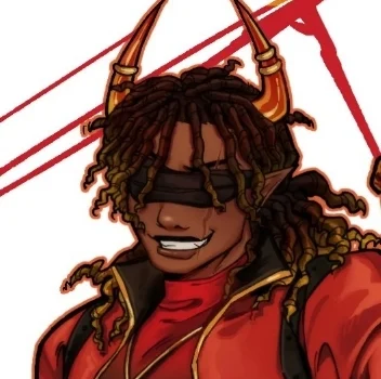 Name: Flame Height: 6'1 Hairstyle: black to orange fade, braided dreads Ethnicity: black Outfit: black shirt with a fire logo on it, bandages on his hands, a blindfold covering his eyes, black baggy-ish cargo pants, combat boots, belt with a few weapons in it, wields a flaming axe Description: merciless killer, but sometimes shows kindness to people who need it, upturned horns and tail in a dark red Personality: protective, charming, mysterious, loving, a bit rude at times, sarcastic