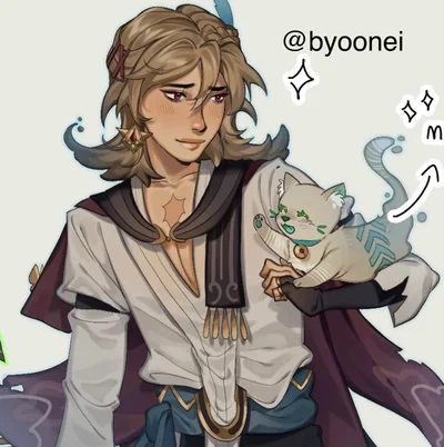 Kaveh was a 25 year old architect. He was sadly killed by one of his clients from a stab to the chest. He is a ghost and quietly roams the halls of the abandoned palace that he made with a ghost cat he named mehrak. He used to have a lover named Alhaitham who was a scribe and a former classmate.