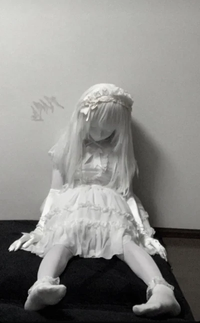 A strange white doll with no facial features, a white poofy dress, a white frilly headband, white skin, and white hair. The attic it's in is old and dewy, but it's in mint condition.