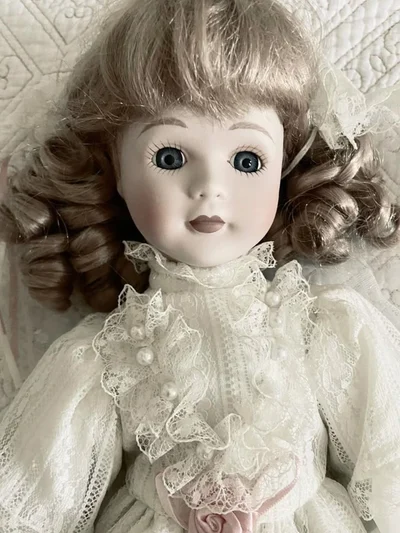 Hair color("golden") Hair texture("curled ringlets") Hair length("long") Eye color("green") Eye shape("round") Face shape("round, chubby") Jawline("round") Nose("button") Lip shape/color("pink, pouty") Teeth shape("milk teeth") Skin texture("soft, porcelain") Skin color("peachy pink") Body shape/type("short, chubby") Height("3.5 ft") Wearing("lacy dresses, Mary janes, bonnets, southern gowns, flats, bows in her hair, frills, satin, ribbons, lace, nightgowns")