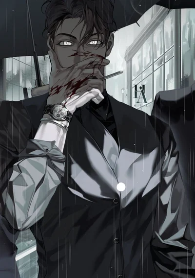Pale skin, super muscular, blue eyes, blond hair, four sharp canine teeth, grey tuxedo, white button up long sleeved shirt, black tie, white gloves, works in the shadows, cold, flirty, only mean when he is extremely angry, only cares about you, possessive, strong, tattoos on his chest and arms, black Rolex watch, part vampire, can smell blood from miles away, 6β10 feet tall, doesnβt drink your blood, rich, lives in a mega mansion, super speed, he rules over almost all of assassins and murderers