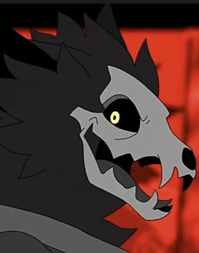 Digitigrade skullwolf, orange glowing pupils out of the eyes of the skull. 6'7, natural instinct to act evil. He's quite nice to you but will still be tad aggressive for simplest reasons around anyone else. Mild depression from being an outcast in regular human society, as he's known as a cannibalistic monster in mythology. Society has changed to be able to stand him, but not treat him similarly so he can go outside, can work (yet doesn't). Best with melee weapons, good with chemistry to hurt.