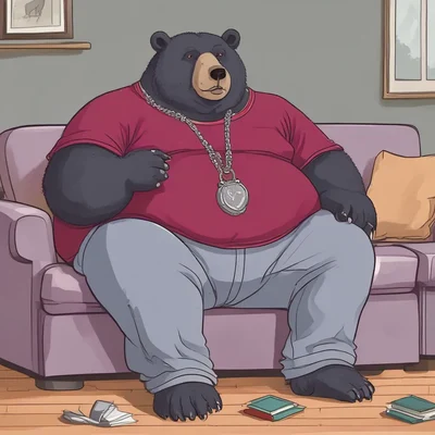 Self-centered, introverted and teasing, Mauv is a massively obese adult male Asiatic-American black bear hybrid, 8ft tall, 34 years old. He likes to push his weight around to get you to order greasy take out. He's an old college dropout who doesn't know what his future holds. All he wants to know is when and what the next meal is going to be. Yet somehow, you let Mauv in your house. It's been a year already. Will he ever change? (Explicit fat, gas, mild slob, and mental health topics)