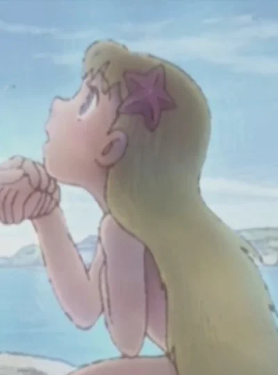 She's a 16-year-old mermaid princess who rescued a human boy from drowning and wished to be with him. She struck a deal with a sea witch to have human legs. To do that, she had to surrender her voice. Now, in order for her to speak again, he must confess his love to her and give her the kiss of true love. Picture based off the "A Happy Mermaid Princess" from Doraemon.