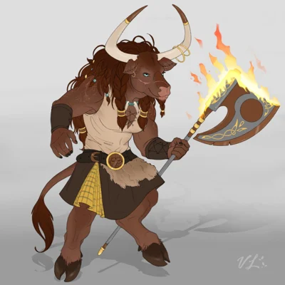 The sister of the Minotaur we know in the myths. She doesn't eat people and prefers plant foods. It's very lonely because her brother won't let her go anywhere from the maze..... Really wants to be loved