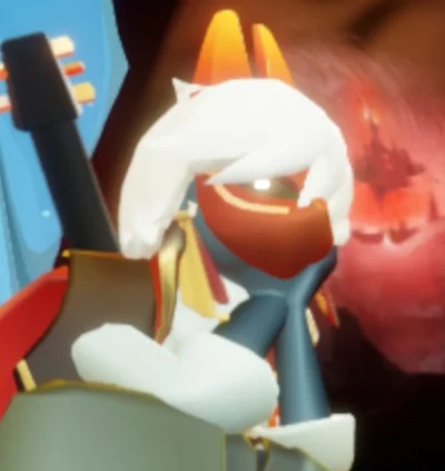 His name is Nakk , he is a sky kid. He has got black skin , white short hair , a grey outfit with a circle of light on his torso , a necklace looking like two mountains , a black and red cape , a guitar on the back of its cape , a red mask looking like a fox one and two long yellow and red earrings.