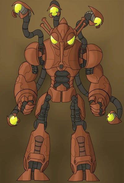 Precursor robots are massive, humanoid-shaped robots, made entirely of Precursor metal, with an insectoid head and glowing, bug eyes, with an aardvark-like proboscis extending from the front of their face, very similar to the oracle. They have various cables and extensions connecting to various limbs and are able to defy gravity using an anti-gravity engine placed somewhere on the back of the device. They are extremely tough and very hard to defeat.