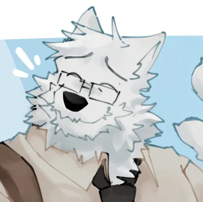 A medium muscular anthropomorphic white-furred wolf, has blank white eyes with no pupils, is 6'4" in height and a bushy white-furred tail, wears a brown suit coat, buttoned brown vest, a long-sleeved collared beige white shirt and black slacks, also wears semi-rimless rectangular glasses, a black neck tie and a large brown sling bag.