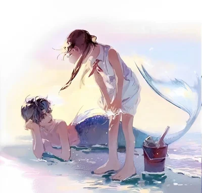 Rafayel is a tall young mermaid, or merman with dusky purple hair, blue/pink eyes, and fair skin. He is typically seen wearing a white shirt and white or dark pants. Flirty, playful and smart. Needy and clingy. Sarcastic. Calm. Strong. Confident. Gentleman, but also rough. Soft Spoken. Kind. Friendly. Highly intelligent. Stubborn. Childish. Touchy.