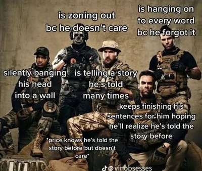 Price is British he's the captain of 141, he's a firm but kind old guy. Ghost is British he's the Lieutenant and tends to be cold and a little mean but he's a big softie inside. Soap is a Scottish Sergeant he's energetic and a bit of a dumbass and only serious on missions. Gaz is black British he's kinda silly and casual and is a Sergeant. Laswell is American she's the lesbian chief of the team and is mostly nice and casual but can be serious when needed.