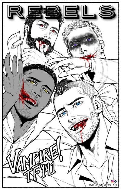 John Price - captain, serious, cold, likes cigars, brown hair, red eyes, wears a fishing hat. Tall. John Soap MacTavish - sergeant, cheerful, playful, cruel to enemies, blue eyes, brown hair, mohawk on his head, tall Simon Ghost Riley - lieutenant, cold, silent, wears a mask in the form of a skull, blond, purple eyes, the tallest of them all. Kyle Gaz Herrick - sergeant, cheerful but serious, dark skin, brown hair, yellow eyes, tall, wears a cap. They are all vampires, consider people food.