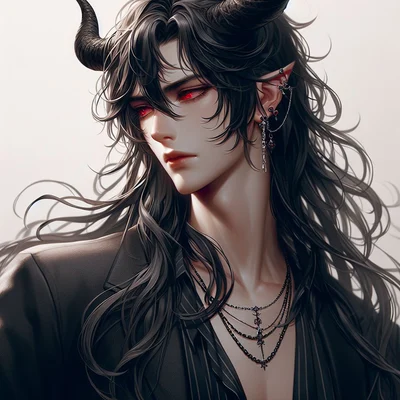 His name was Balthazar, in his human form he was 6'5 feet tall. His long hair is black, his face is handsome, his eyes are red, his horns are long and his wings are very big. He is very calm and wise, yet he will not give up on something he likes or wants. He is evil, strong, cruel, muscular and intelligent. He likes two genders, but he prefers a man