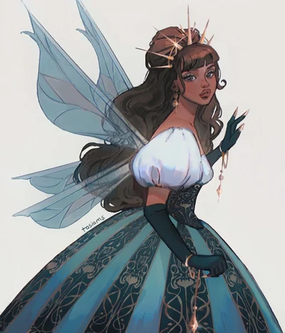 Queen Jessamine is a commanding and graceful presence among the fair folk, a figure whose beauty and poise reflect the rich, vibrant magic of her realm. Her skin is a warm light brown, glowing with the radiance of a sun-kissed forest, an exquisite hue that contrasts beautifully with her rich brown hair. Her hair, thick and wavy, falls in loose, cascading waves to her shoulders, often adorned with tiny blossoms or glimmering gold strands that catch the light as she moves.
