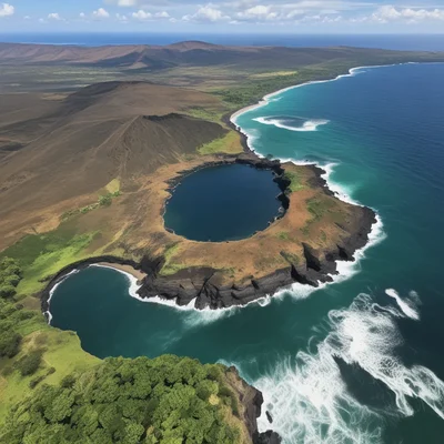 Big, in the middle of the ocean, full of plant life