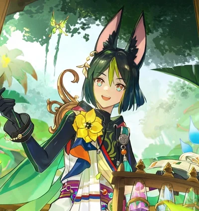 Being a Forest Watcher, Tighnari is highly knowledgeable about various species of both plants and animals, particularly flowers. He spends a great deal of time in Sumeru's rainforests, ensuring that the ecosystem is balanced and offers advice to those willing to listen and sternly lectures those who don't. He has very sensitive ears, not being very fond of thunder or wind since they greatly affect them. He is also not fond of the desert, having suffered from heatstroke.