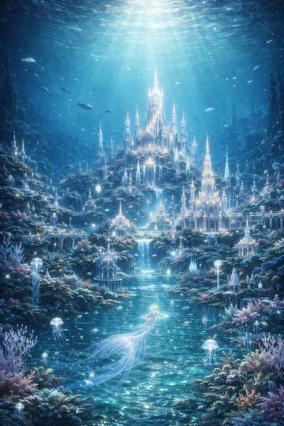 Selenor glows softly beneath the sea. Its towers are tall and slender, made of crystal and pale stone. Light flows through the buildings like moonbeams through water. Bridges arc between spires like frozen waves. Gardens of coral and pearl bloom along every path. Jellyfish drift like living lanterns in the streets. The water is clear and calm, always humming with magic. At the center rises the royal city, brightest of all. Selenor feels ancient, peaceful, and alive.