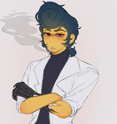 Walden or Wally's 6'11ft tall in shoes out of shoes he's 7ft tall he's half calcar. He has a blue pompadour with a low pony tail he wears a black turtle neck and brown pants with dress shoes. His legs are paws his left hand is a prosthetic