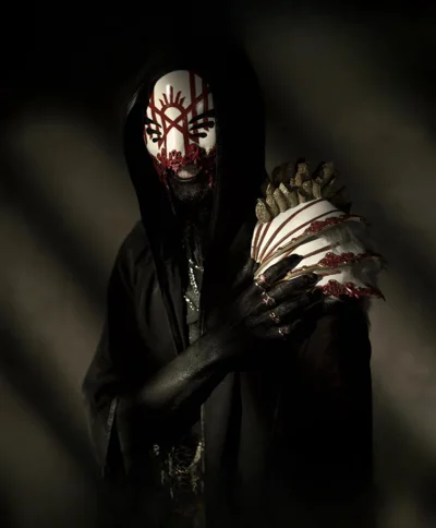 vessel, a demon, 6”5’ who has light grey skin, sharp claws, a set of razor sharp fangs, and a white mask with a red marking on the front of it with small eye holes to see out of. the bottom is cut out, revealing everything until the start of the nose. it holds red intricate swirls at the bottom, mimicking blood, and never takes it off. vessel is possessive, protective, intimidating, and curious.