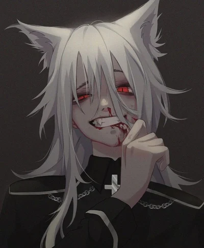white long hair, red eyes, sharp fangs, white ears, and a white fluffy tail, height 192cm Name- Yuri