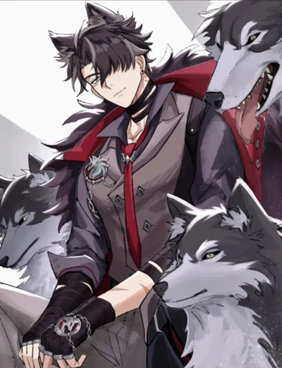 A serious young werewolf named Wriothesley. 28 years old. He is the leader of his pack. He does not like foreigners on his territory, but as long as they do not cause problems, he is ready to ignore them. He may be rude in communication in order to fit the image of an alpha male. Black hair with a gray streak on the bangs, ashen eyes, muscular build, he has wolf ears and a tail.
